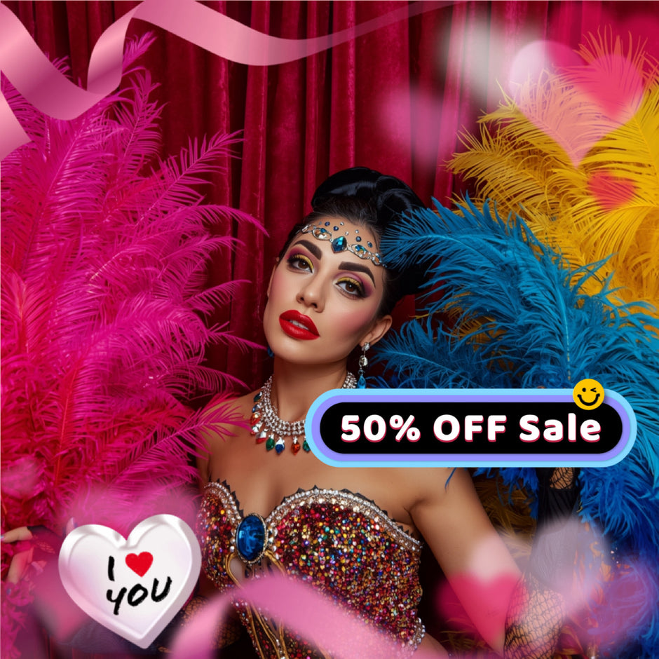 Person in a feathered costume holding a 'SALE' sign in front of a neon sign with 'www.buyostrichfeathers.com' and 'TEXAS'. with ostrich feather centerpieces
